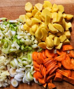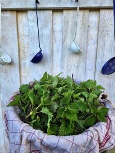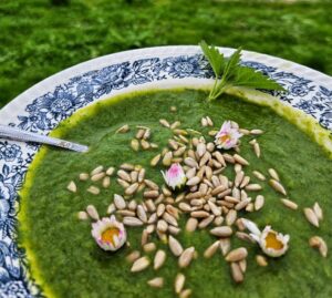 Eine gute Handvoll frischer Kräuter nach Geschmack und Saison wie: Bärlauch, Schnittlauch, Giersch, Oregano, Gundermann, Minze, Brennessel etc.